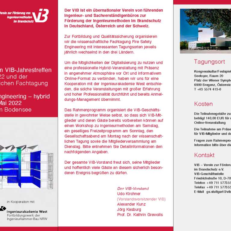 Die Deutschen Kollegen vom Verein zur Förderung von Ingenieurmethoden im Brandschutz (VIB) veranstalten am 9. Mai 2022 in Bregenz eine wissenschaftliche Fachtagung zum Thema Fire Safety Engineering.